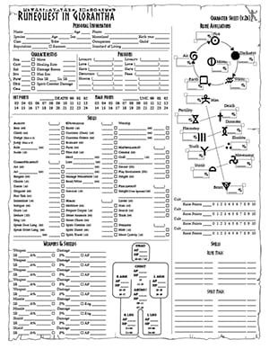 In my previous post, I posted my first take on the new RuneQuest Glorantha character sheet based on previous RQ sheets and the new RuneQuest Quickstart.  After I posted it, some folks pointed out that a number of things were missing or could be improved, such as rune affiliations, cults, and rune points.  I’m a big fan of keeping all the things players can do in combat or interacting with the world on the front of the character sheet, as players tend to look to their character sheets for inspiration.